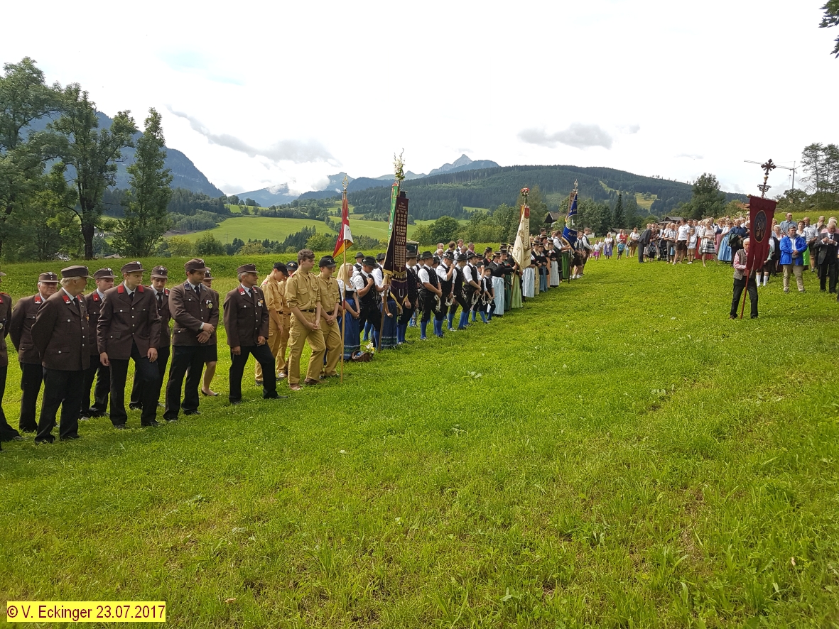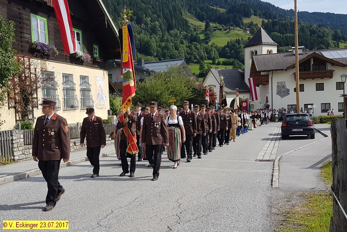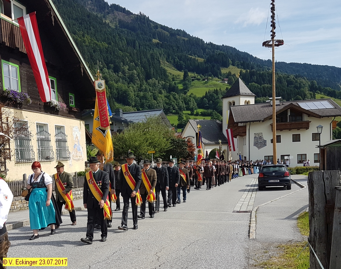 Nach dem feierlichem Schlusssegen und Ehrensalven der Prangerschützen Goldegg (dieses Jahr im Speziellen für die langjährigen Mesnerdienste von Barbara Stöckl „Brunhäusl-Wawei“ und für die langjährige Tätigkeit als Pfarrgemeinderat an den Ehrenhauptmann der Prangerschützen Sepp Obermoser) wurde so richtig gefeiert.