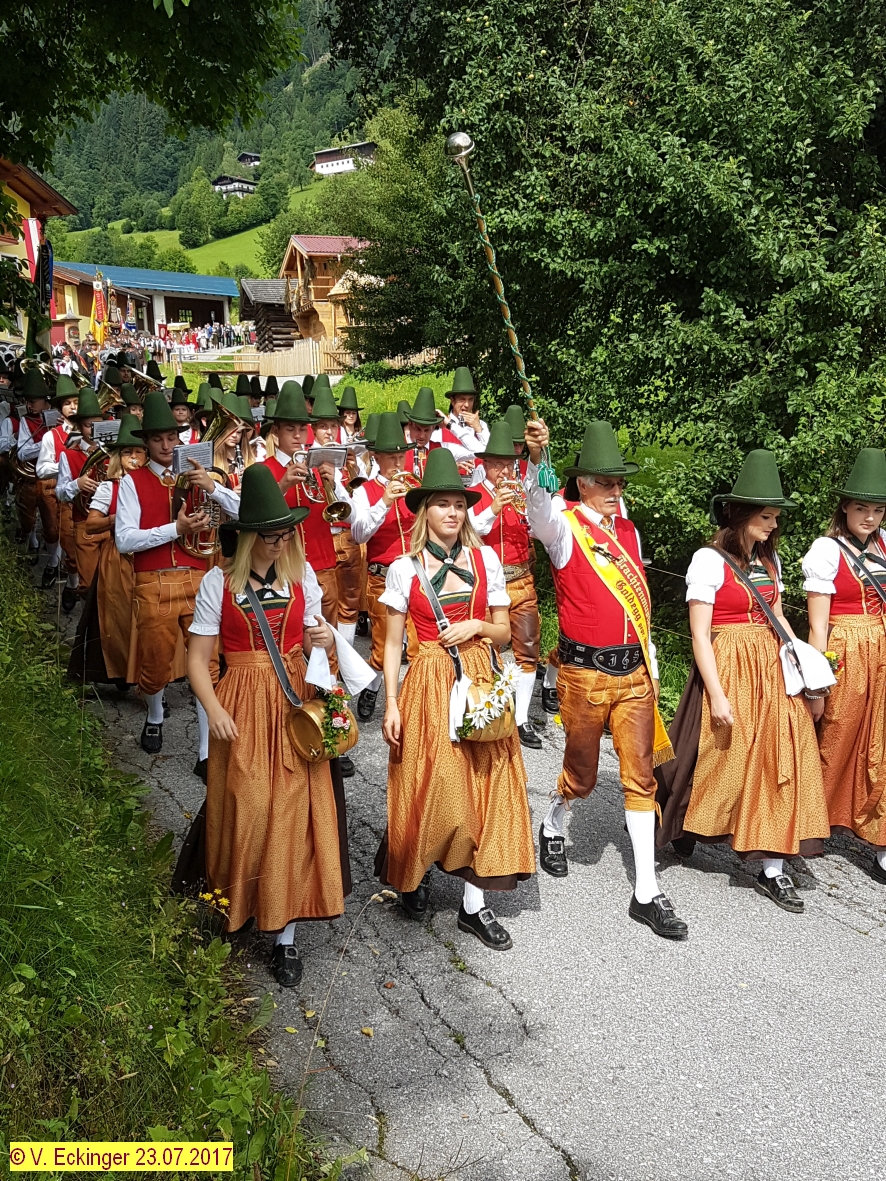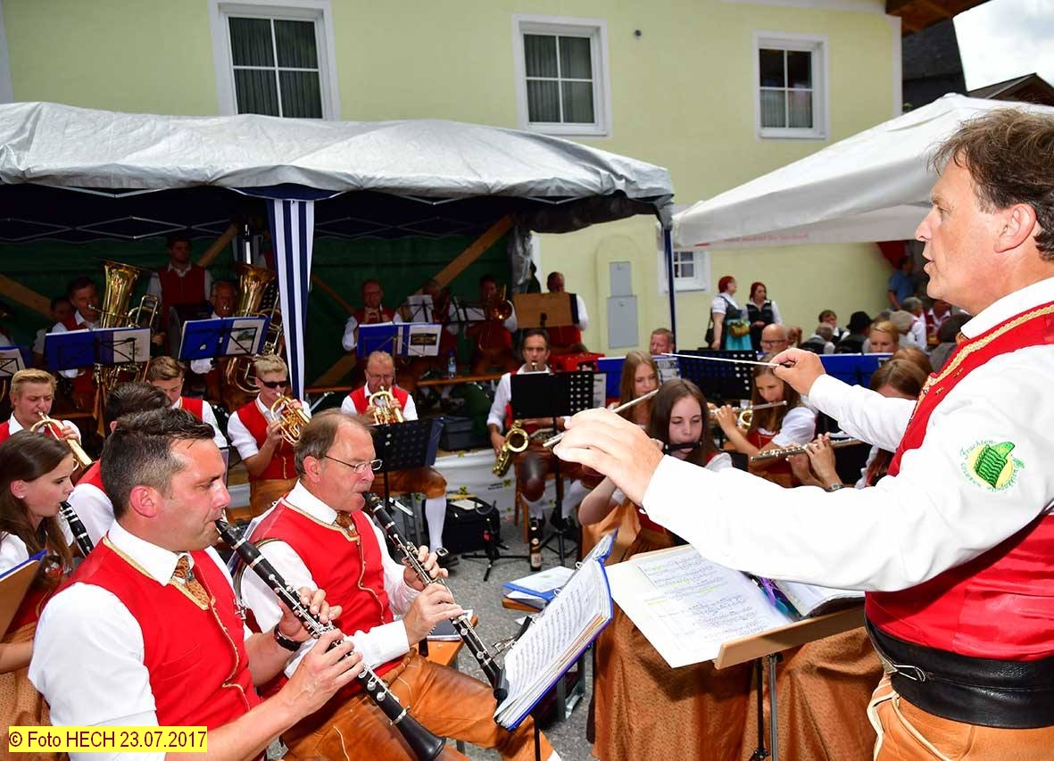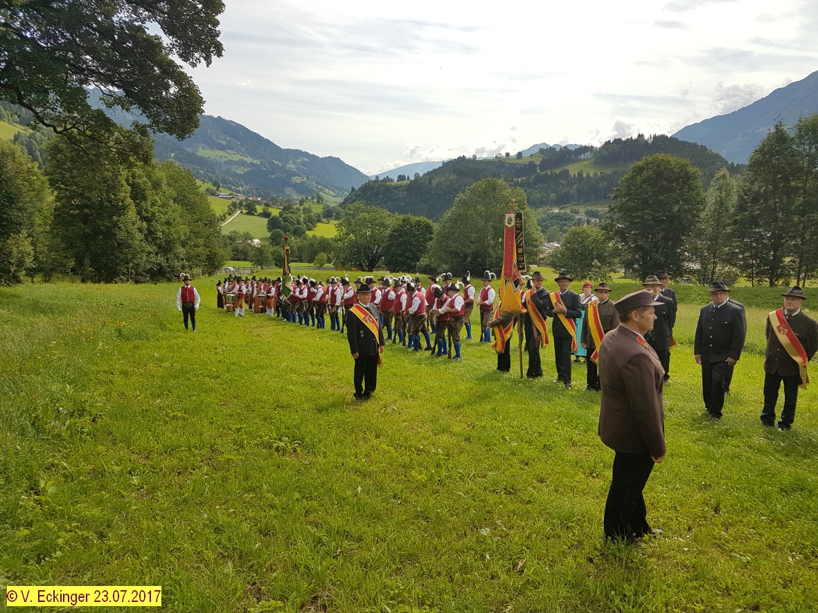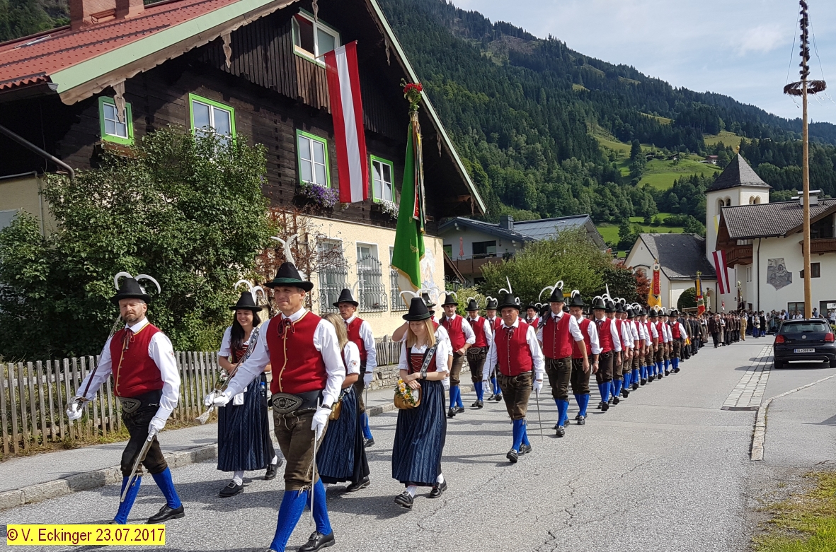 Nach dem feierlichem Schlusssegen und Ehrensalven der Prangerschützen Goldegg (dieses Jahr im Speziellen für die langjährigen Mesnerdienste von Barbara Stöckl „Brunhäusl-Wawei“ und für die langjährige Tätigkeit als Pfarrgemeinderat an den Ehrenhauptmann der Prangerschützen Sepp Obermoser) wurde so richtig gefeiert.